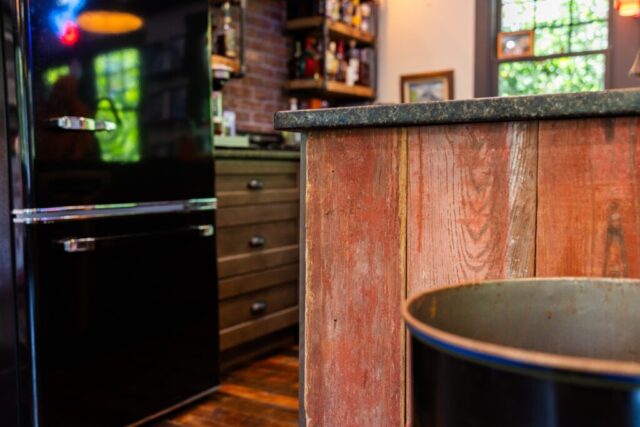Working with the homeowner to bring his vision to fruition, we selected Original Face Mixed Hardwoods Solid Plank Flooring, Faded Red Barnsiding to clad the bar, Mixed Hardwoods for the shelving and range hood, and a Hand Hewn Box Beam to tie everything together.
