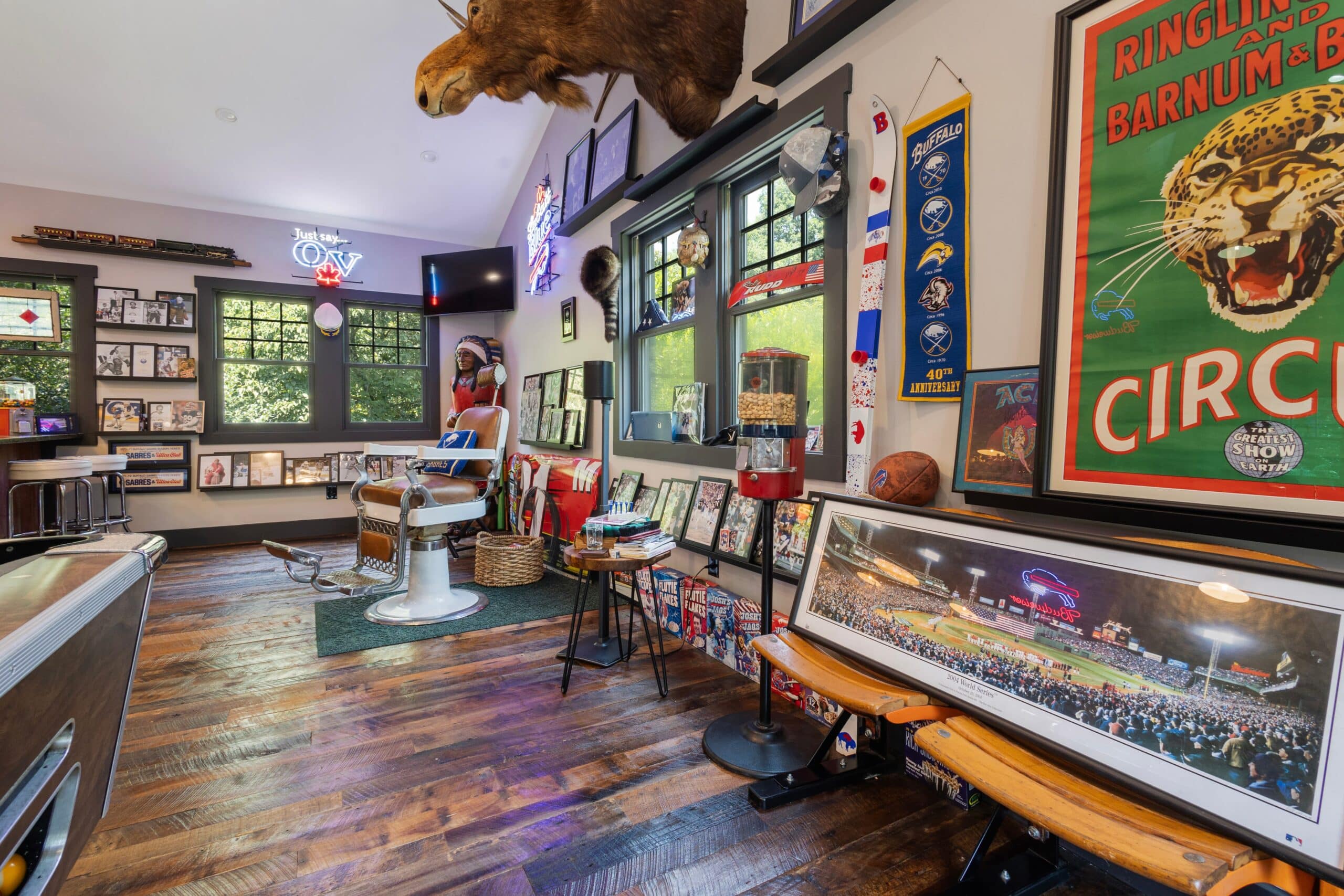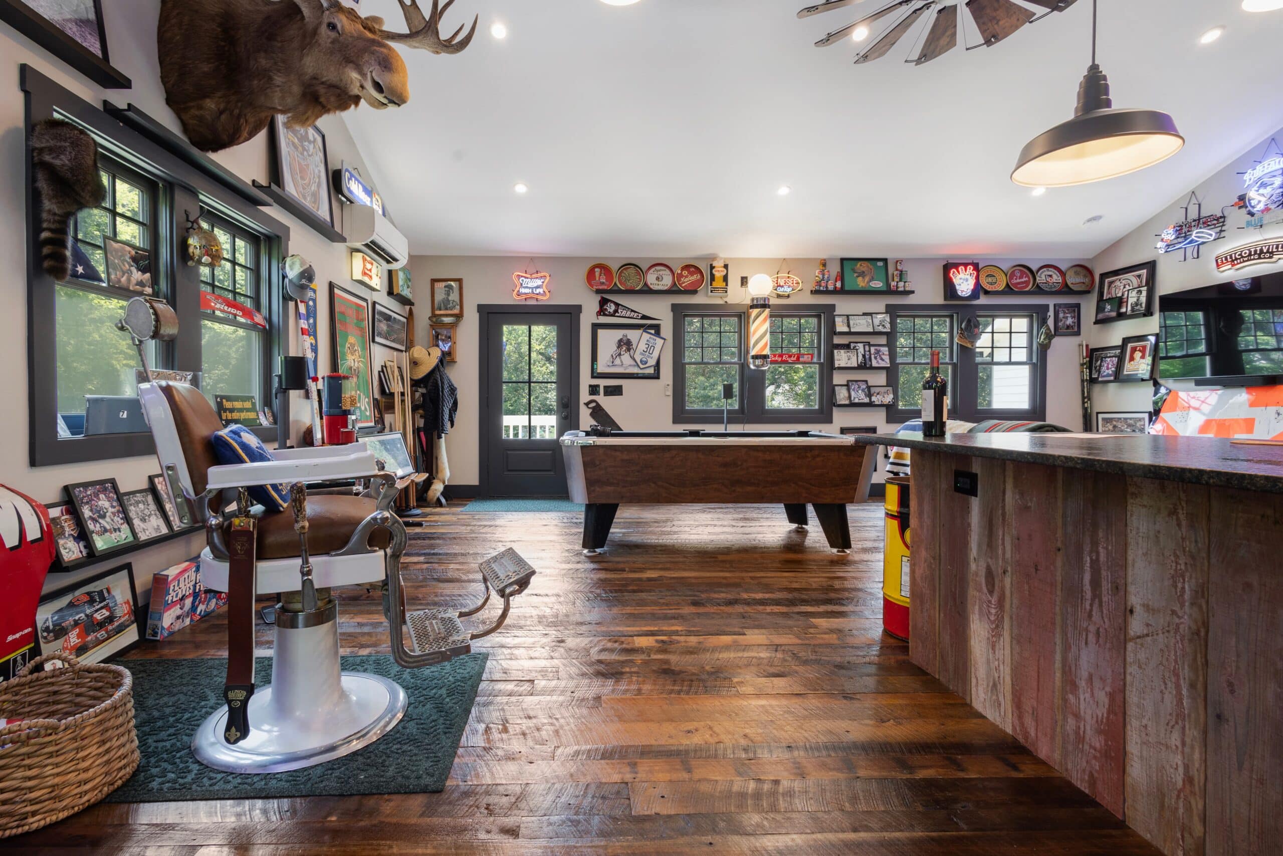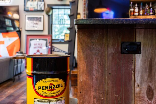 Memorabilia from every angle fills the room, including actual racecar panels that turn an already standout space into something you truly can’t recreate. Stories tucked into every corner, pieces practically inviting you to kick back and linger (perhaps in the vintage barbershop chair).