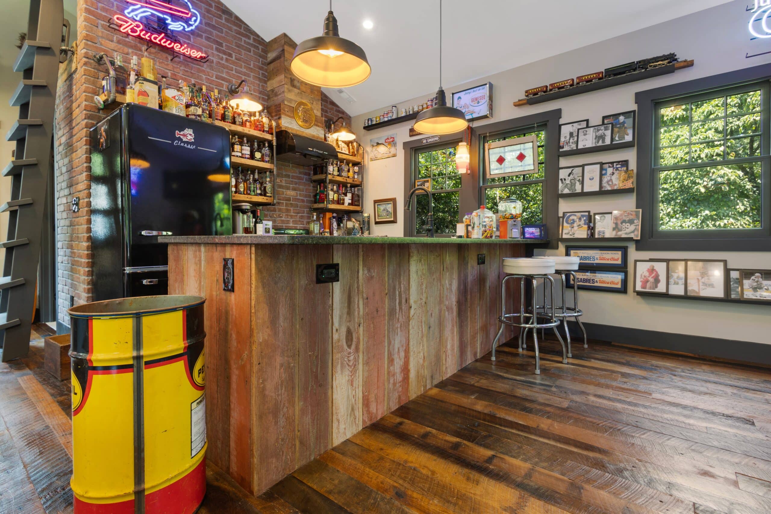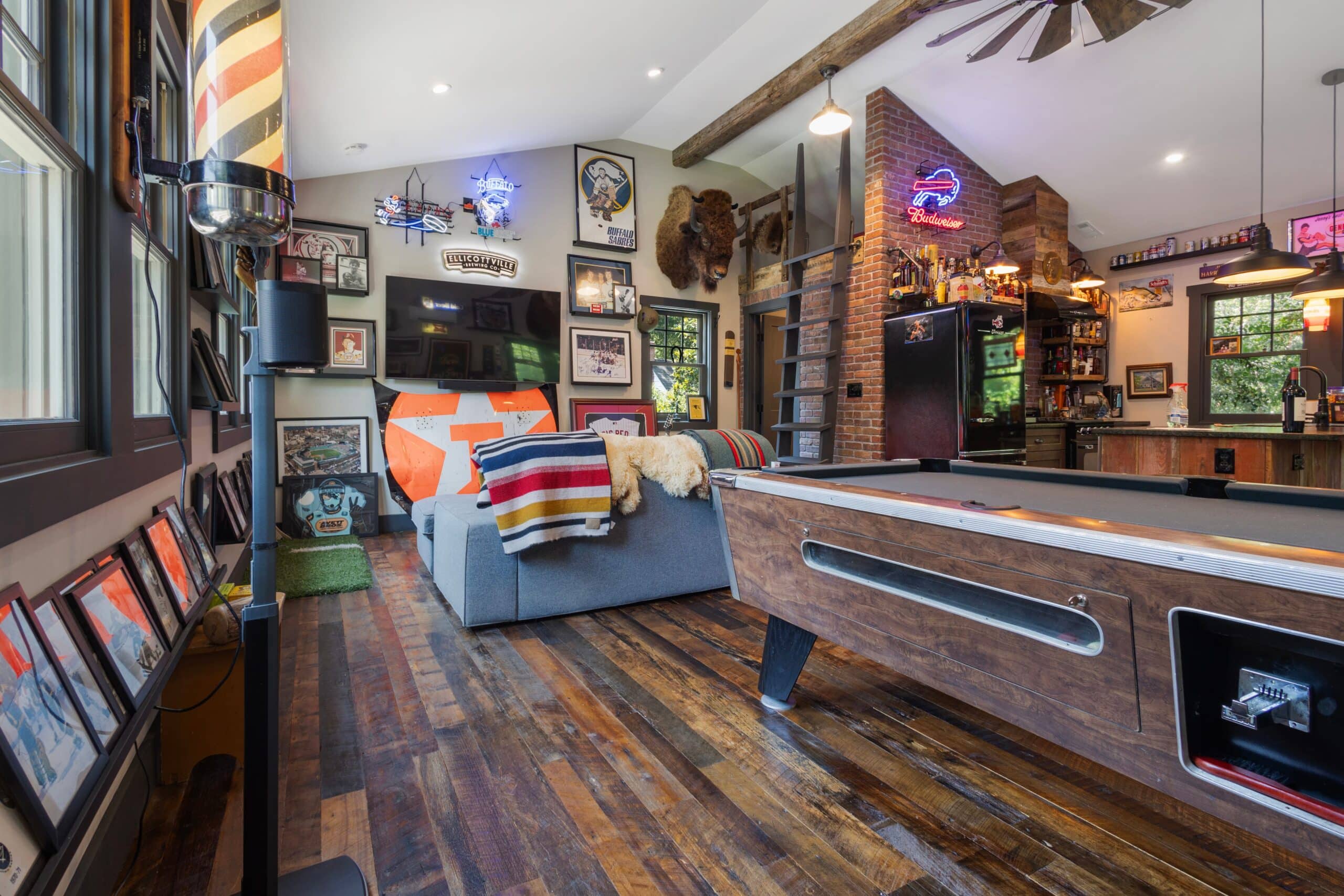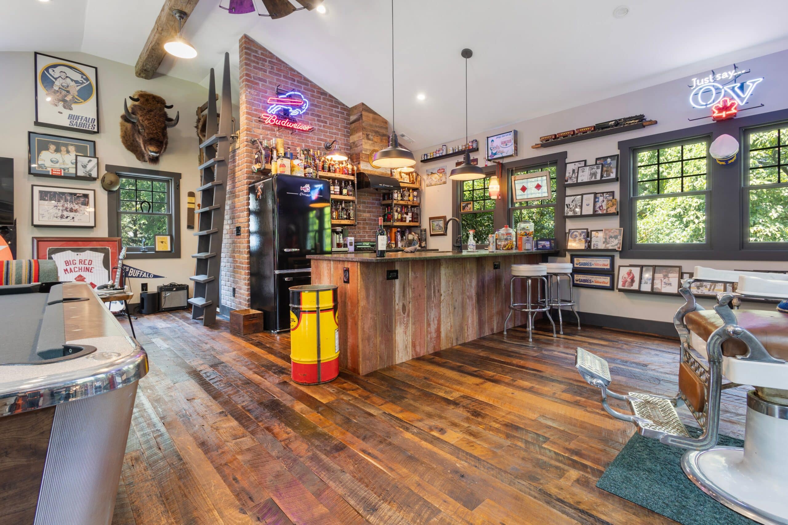 This customer built a mancave that feels like your favorite bar and a sports hall of fame shook hands and decided to share the same address. From the warm reclaimed wood flooring that instantly sets the tone, to the impressive bourbon lineup that gives the bar a little extra swagger, this room pulls you in with its cozy-but-commanding charm.